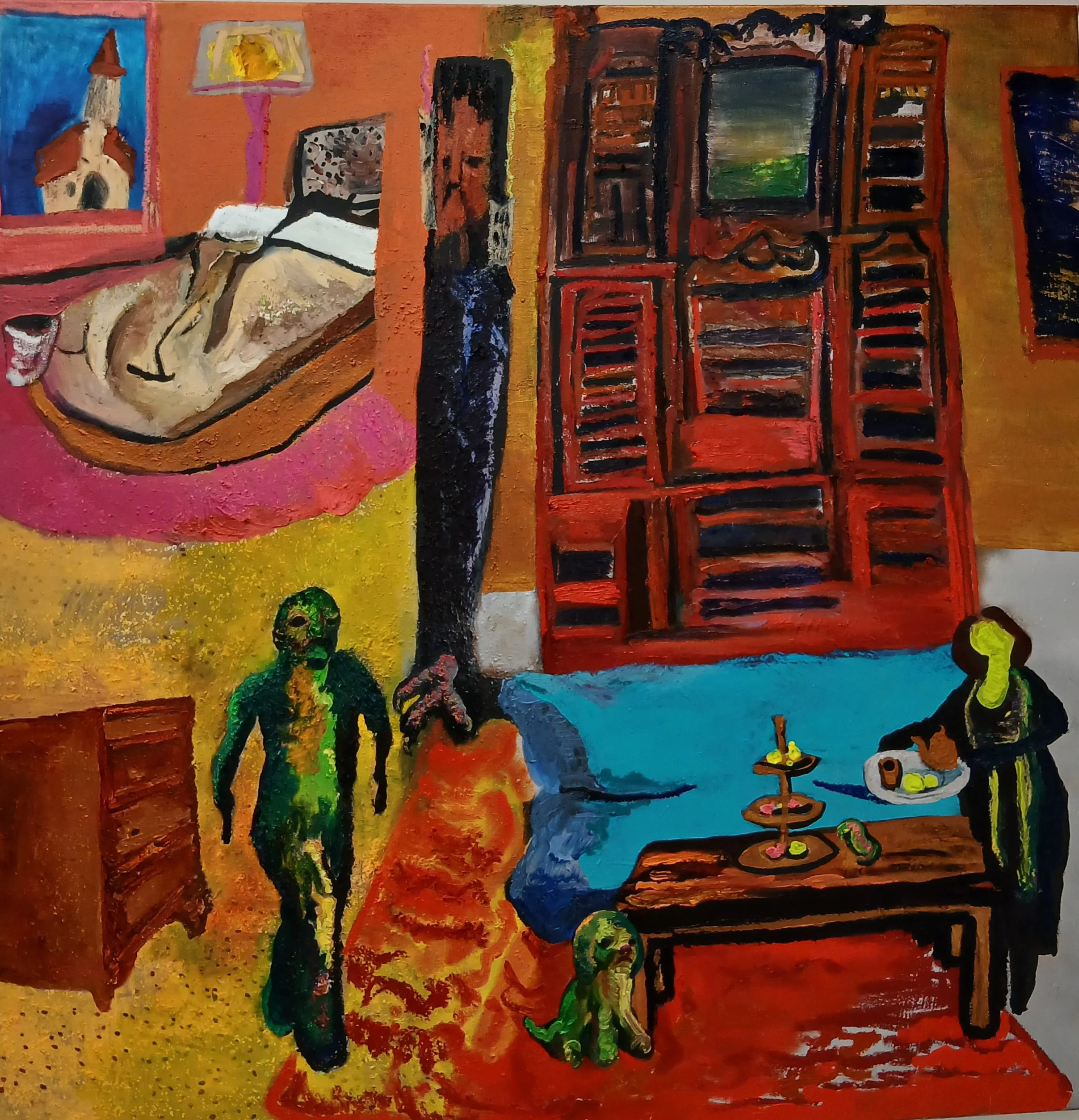 In this penetrating exploration of social performance and hidden desires, the painting deconstructs Somerset Maugham's narrative of power, class, and concealment and reveals the delicate choreography of social pretence - where silence becomes a currency of survival, and unspoken tensions simmer beneath a carefully maintained surface. Here, the characters are not merely figures, but living embodiments of societal constraints, their bodies and gestures mapping the invisible boundaries of class, desire, and institutional power. The work becomes a profound meditation on the performative nature of social relationships, where what remains unsaid speaks more eloquently than any confession.
